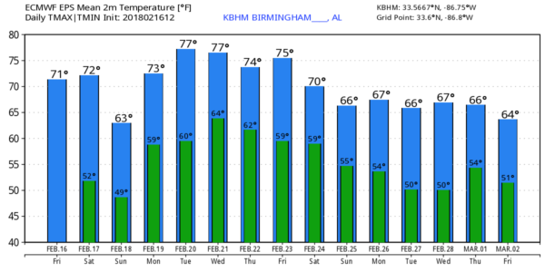 NEXT WEEK: The upper ridge of the Gulf of Mexico will strengthen and shift northward; meaning a warm late winter week for Alabama. Highs will be in the 70s each day, and we will be close to 80 Tuesday afternoon. Showers Monday and Tuesday will be widely scattered; rain will be more likely Wednesday through Friday as another front stalls out just north of here. See the Weather Xtreme video for maps, graphics, and more details.