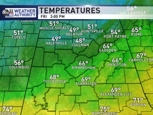BIG THERMAL CONTRAST: As expected, we have a big thermal range across Alabama this afternoon thanks to a cold front that is near I-59 at 3:00 p.m. Temperatures have slipped into the chilly upper 40s at Haleyville and Cullman, but are close to 70 degrees south of I-20.