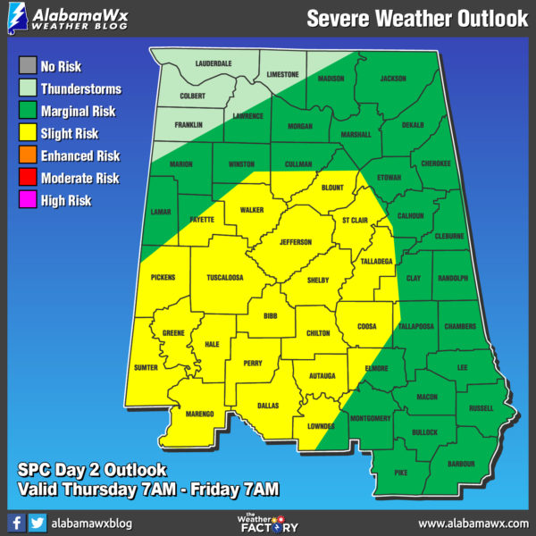 A slight risk of scattered showers and maybe a thunderstorm or two will be possible over the northwestern quarter of Central Alabama throughout the remainder of the afternoon. Those risks will continue to rise over the evening and become likely during the late night and overnight hours as the rain and thunderstorms slowly move eastward. There is a Marginal Risk for severe storms has been defined for the northwestern corner of the state, but at this point the threat is very low with gusty winds being the main threat. For the remainder of Central Alabama, the risk for any showers or storms will be very low closest to I-59 and I-20/59 while the east and southeastern parts of the area staying dry. Today’s highs will be quite mild to warm, reaching the upper 70s to the lower 80s from north to south. Lows tonight will be in the upper 50s to the mid-60s.