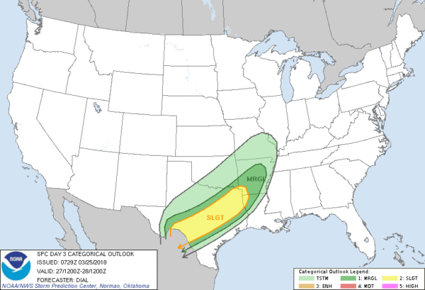 The wedge holds onto the pattern into Tuesday, but the surface flow comes around more to the south. This should mean our temperatures will warm back up into the 60s with the potential for only an isolated shower or two. While we are dealing with the wedge on Monday and Tuesday, the likelihood of severe weather remains well to our west across parts of Texas and Oklahoma (see Day 3 outlook graphic below).