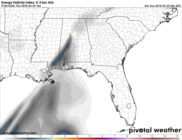 The big trough over the Southwest US moves out across West Texas on Wednesday reaching the Lower Mississippi River Valley Thursday. From late Wednesday into Thursday appears to be our best chances for rain and thunderstorms. While the system appears likely to produce the threat of severe weather to our west from Monday into Wednesday, the system seems to be losing its punch as it arrives in our vicinity as seen on the Energy Helicity Index (EHI). As I noted yesterday, this is still a ways out, so we’ll have to maintain a close eye on future model runs for any changes that might impact this forecast.