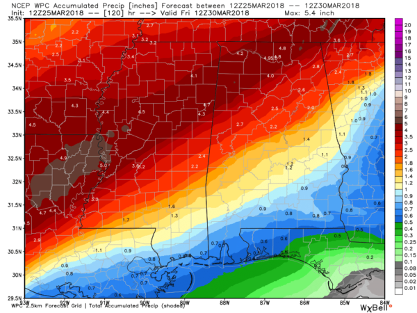 Rainfall amounts are still forecast to vary quite widely across Alabama as the gradient in amounts from Southeast Alabama to Northwest Alabama remains as we saw yesterday. Amounts have come up a good deal, however, since the graphic now goes through Friday morning. Amounts will range from near three-quarters of an inch in Southeast Alabama to over 4 inches in the northwest corner.